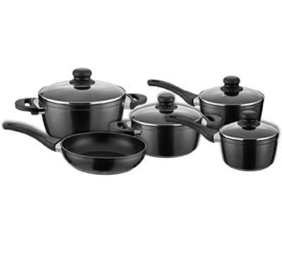 - Piezas: 9, olla con tapa de 16 cm, olla con tapa de 18 cm, cacerola con tapa de 20 cm, cacerola con tapa de 24 cm, sartén hondo de 24 cm